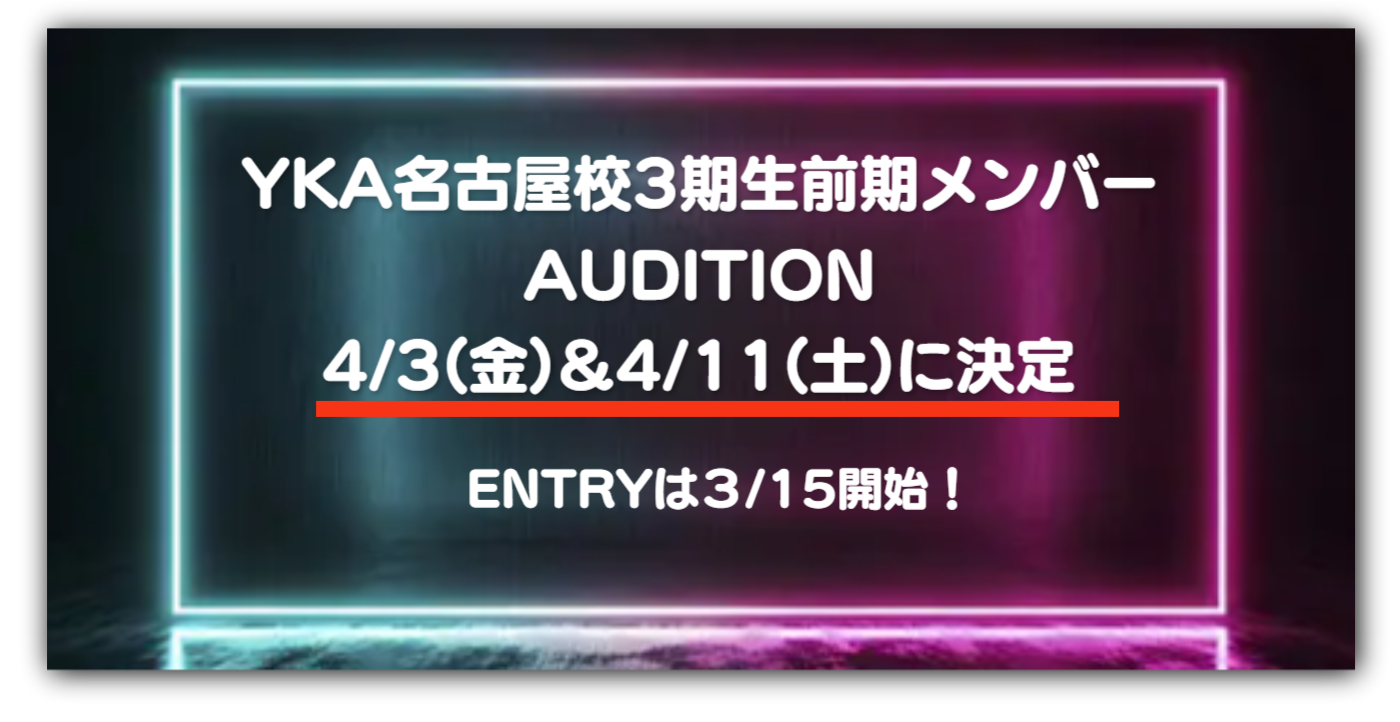 | ◆YKA名古屋校のオーディション期間 | ①【3月末~4月】、②【8月末~9月】、③【12月】 それぞれの期間内に2日オーディションを開きます。※③のみ1日 エントリー開始日は3/15、8/1、11/15となります。 |